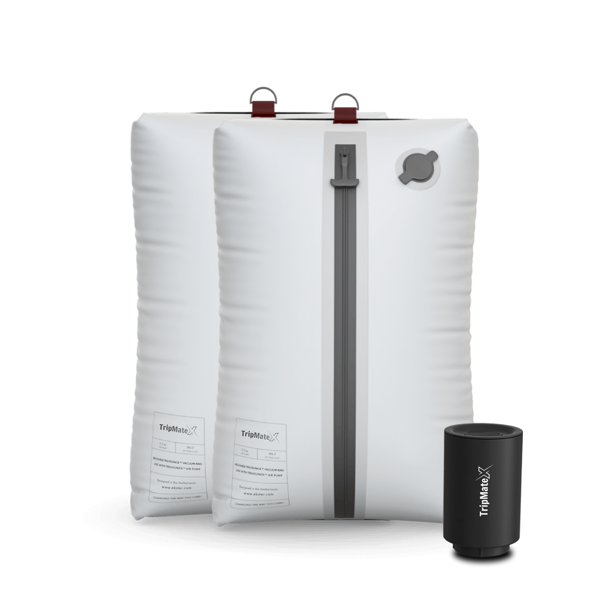 The modular TripMateX™ Vacuum Bags fit in all TripMateX bags and any carry-on or suitcase. It compresses 15+ clothing items so you can pack more without any hassle.